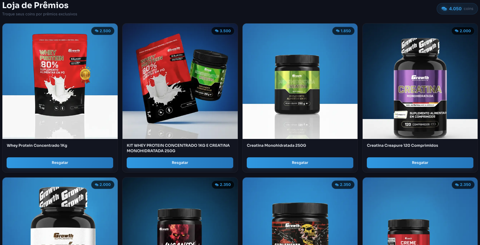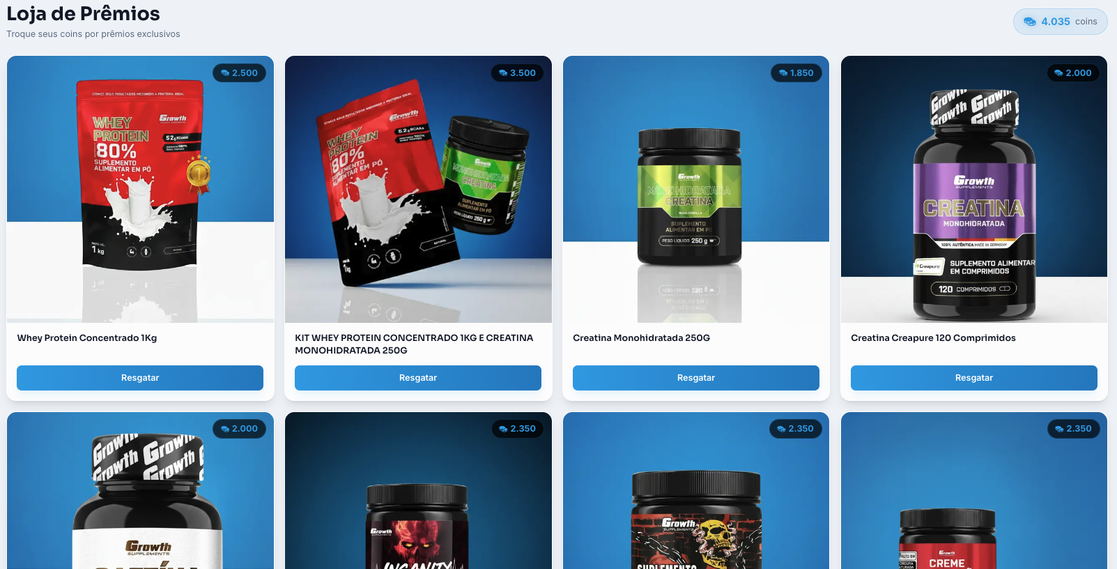 A plataforma tem sua própria moeda. Você ganha treinando, acumula coins e troca por produtos físicos da Growth Supplements.