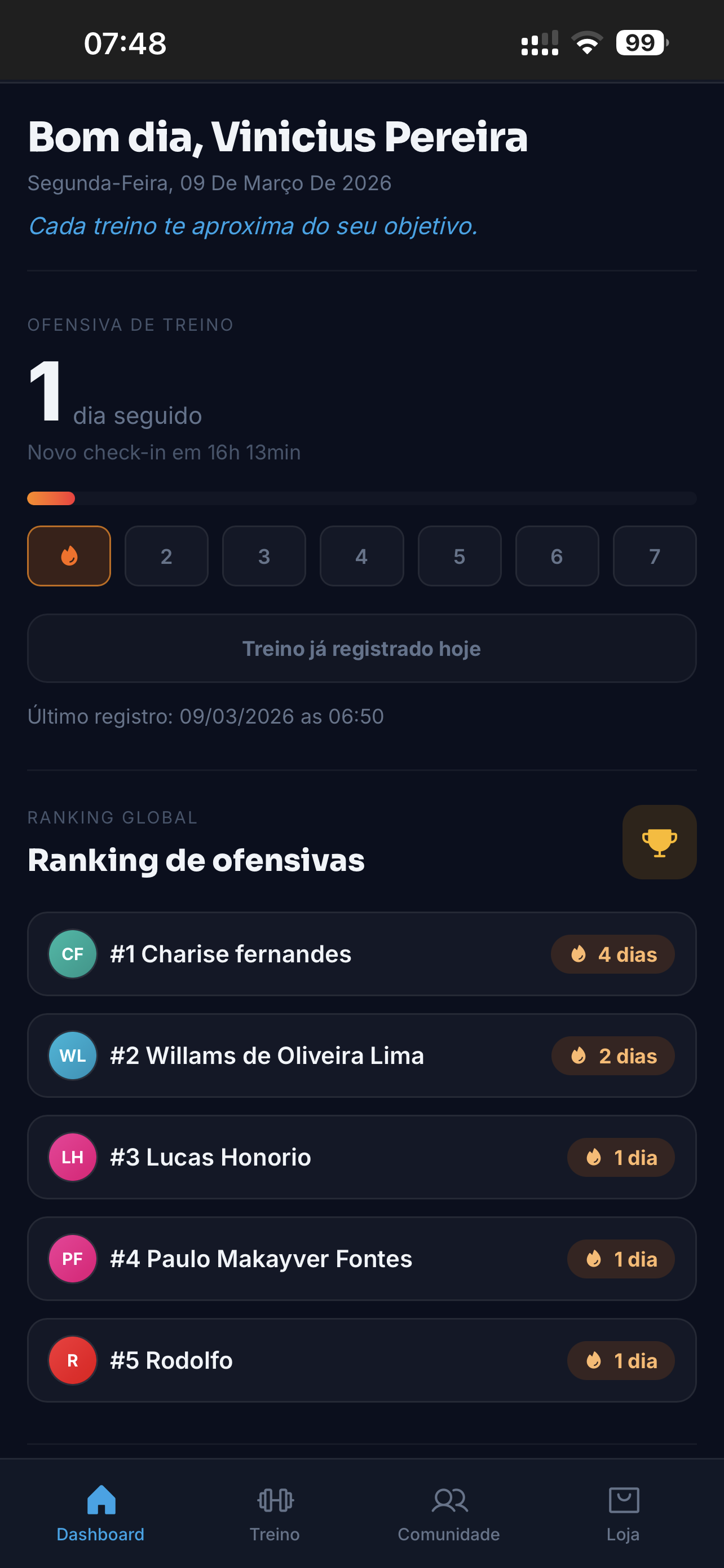 Treinou hoje? Sua chama continua acesa. Perdeu um dia? Começa do zero. O ranking global mostra quem não para — e você vai querer estar no topo.